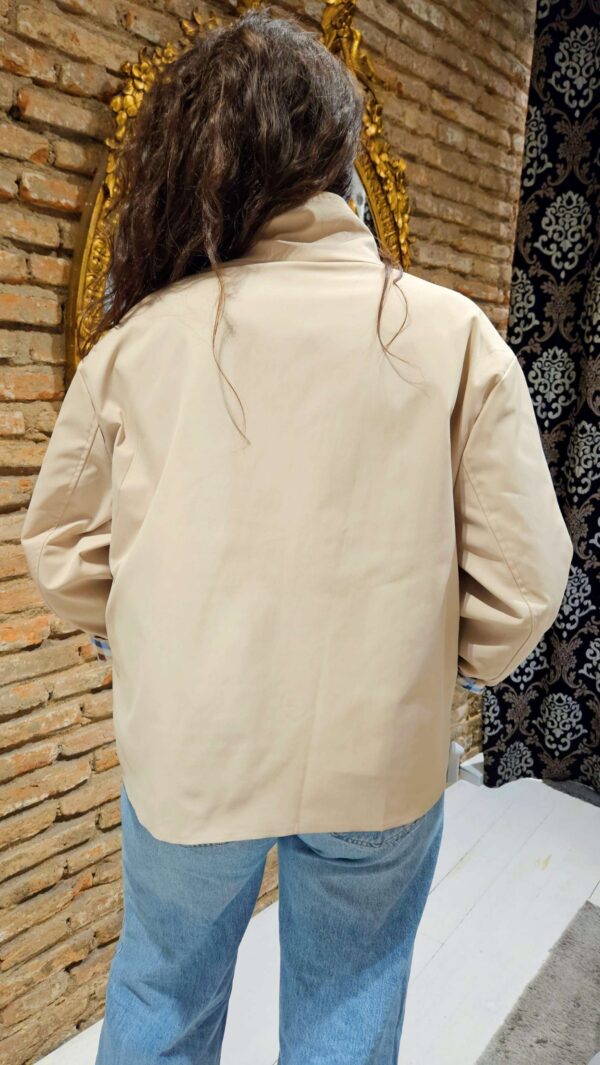 Gabardina corta de color camel con forro a cuadros azules y blancos. Este estilo está denominado «trench coat». Es una prenda muy versátil para los cambios de temporada. Cuello alto y bolsillos en el delantero. Cierre con botones en el delantero.