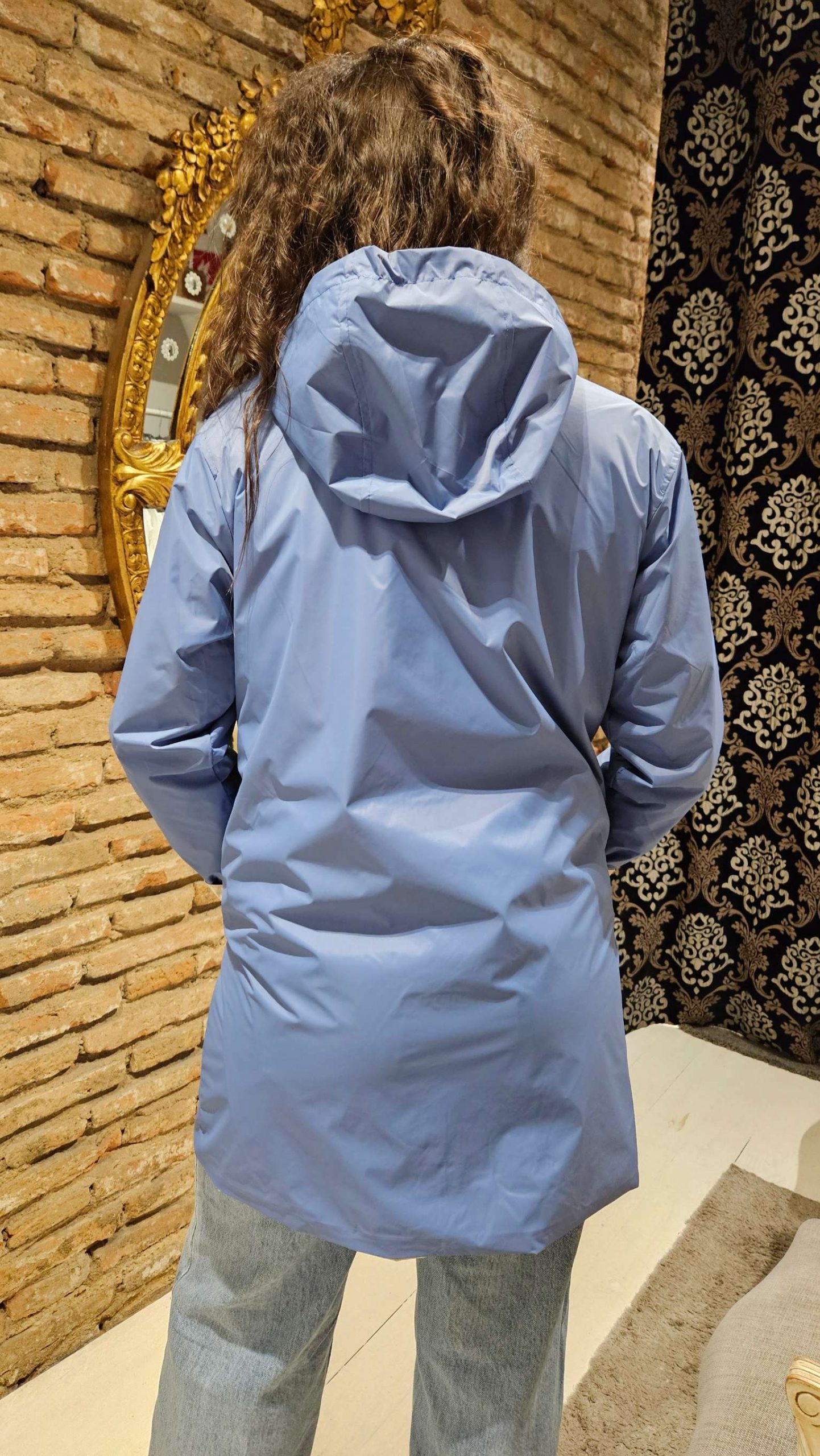 Parka reversible impermeable en color azul-dorado con capucha de longitud media. Ligero y práctico para cambio de estación. Cierre con cremallera en la parte delantera. Bolsillos laterales. Corte recto.
