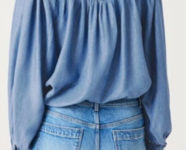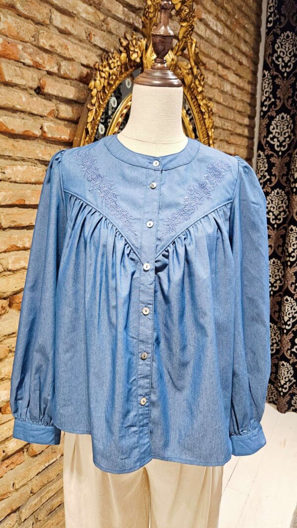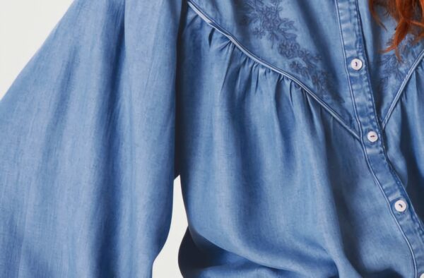 Blusa de tejido vaquero suave, realzada con un delicado bordado de hilo en la parte superior del delantero. Su silueta ligeramente amplia y las mangas abullonadas aportan un aire femenino y sofisticado. Una prenda versátil que combina el encanto artesanal con la comodidad del denim perfecta para llevar en cualquier temporada.