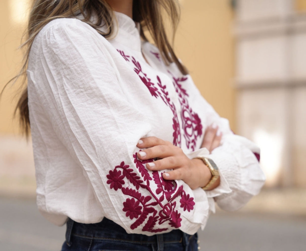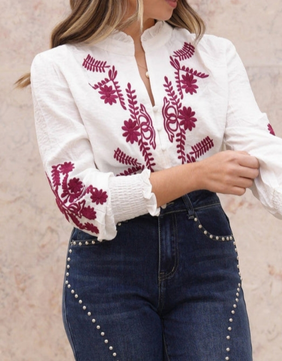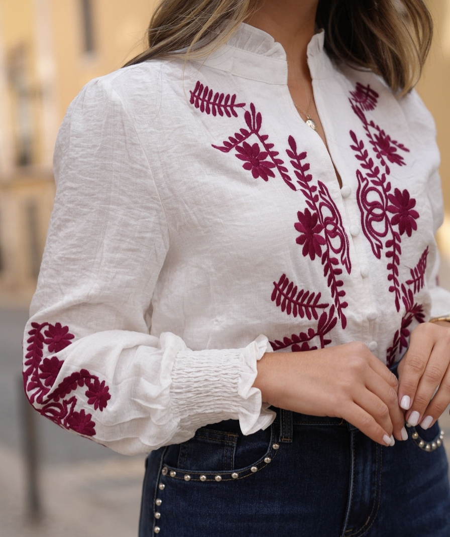 Blusa en color blanco con bordados florales en contraste en la parte delantera y mangas. Diseño con cuello tirilla con pequeños volantes, Cierre con botones forrados y fruncido en los puños.