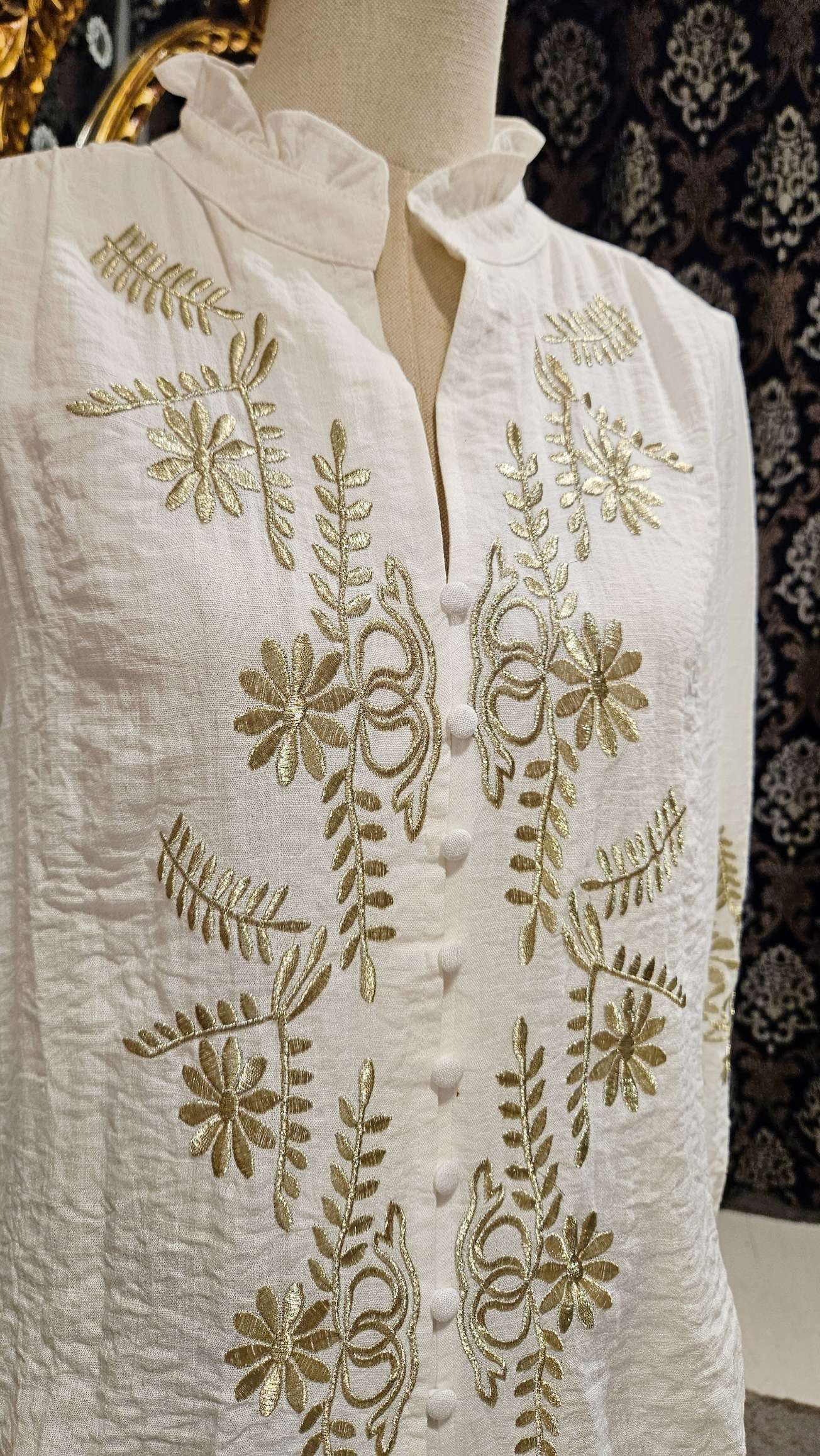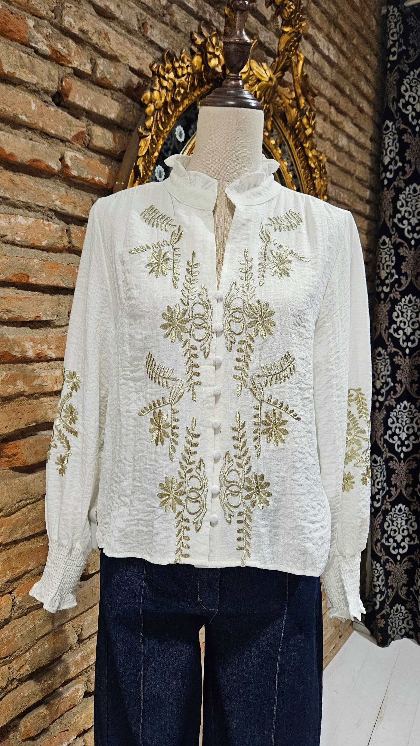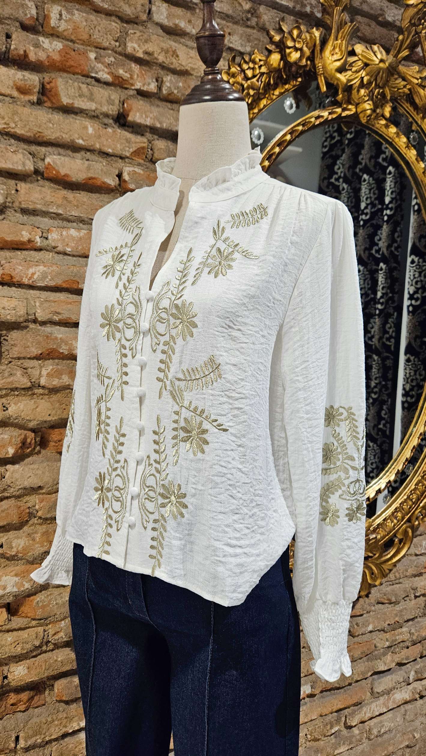 Blusa en color blanco con bordados florales en contraste en la parte delantera y mangas. Diseño con cuello tirilla con pequeños volantes, Cierre con botones forrados y fruncido en los puños.