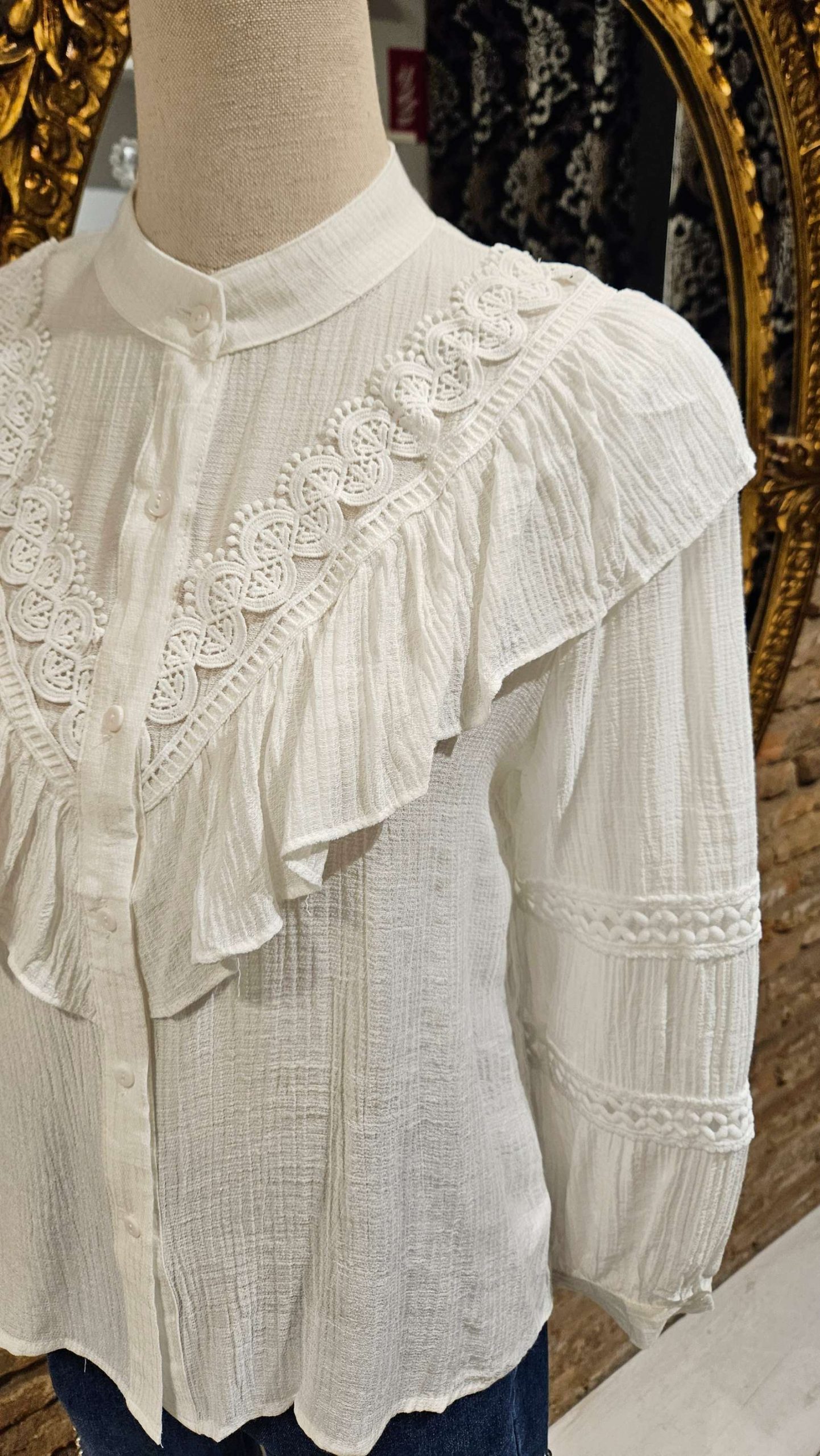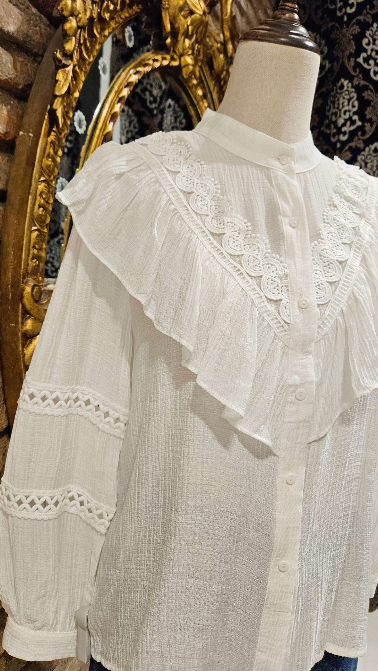 Blusa de estilo romántico, delantero en forma de V con volante y encaje superpuesto. Manga larga con detalle bordado. Cuello tirilla.