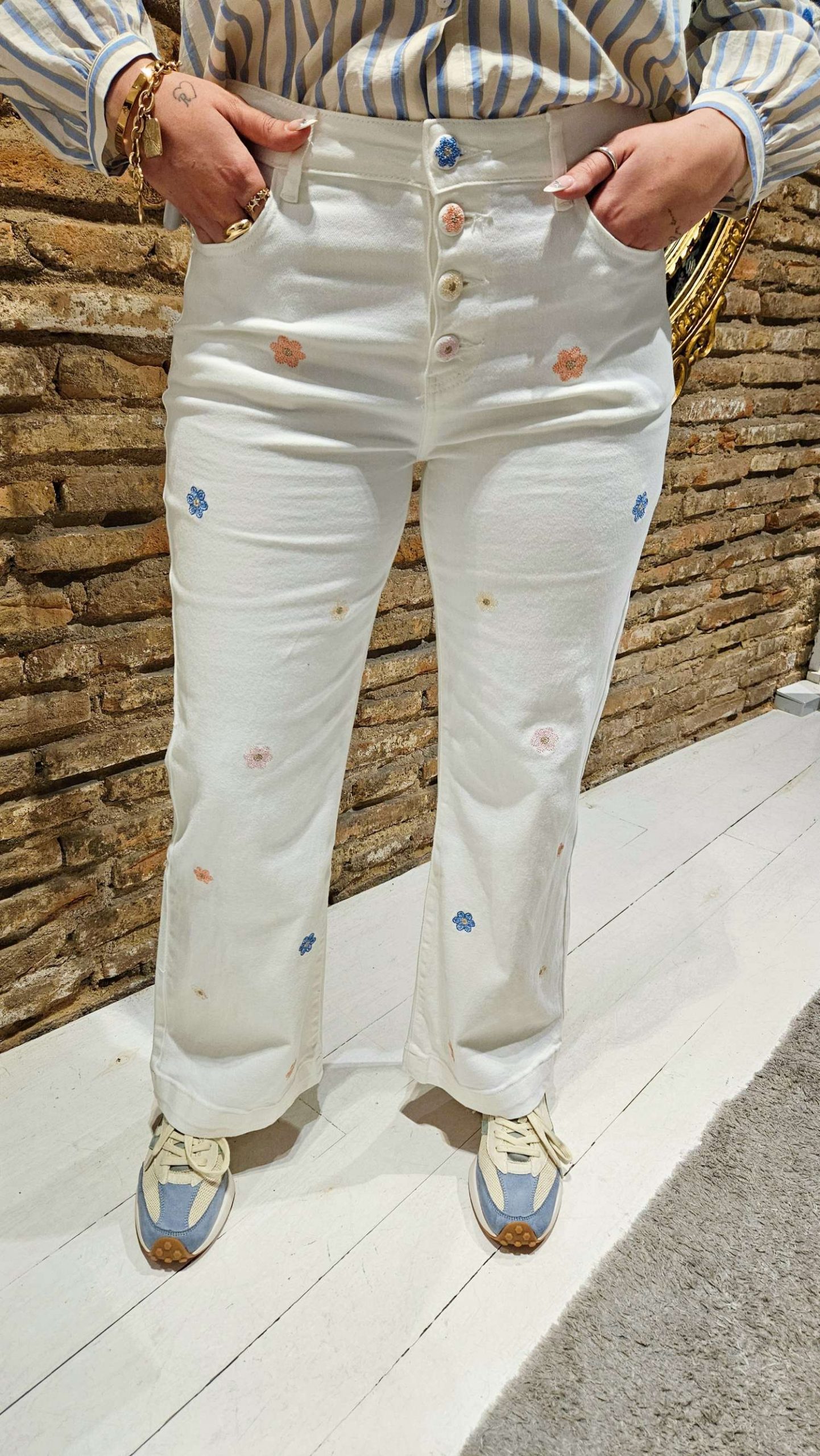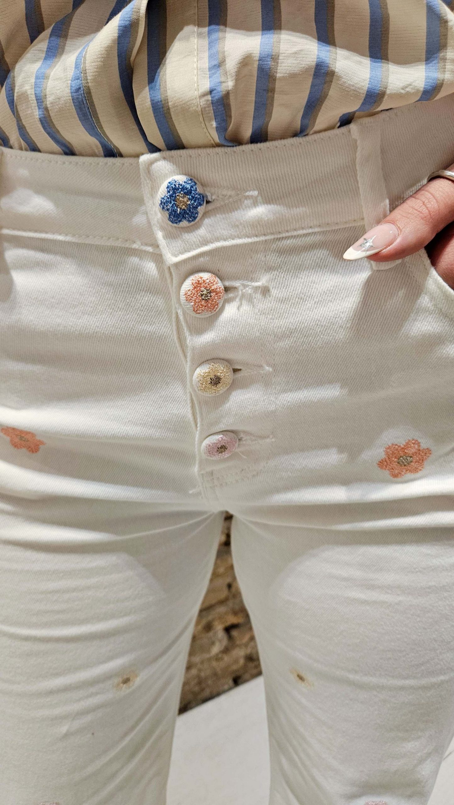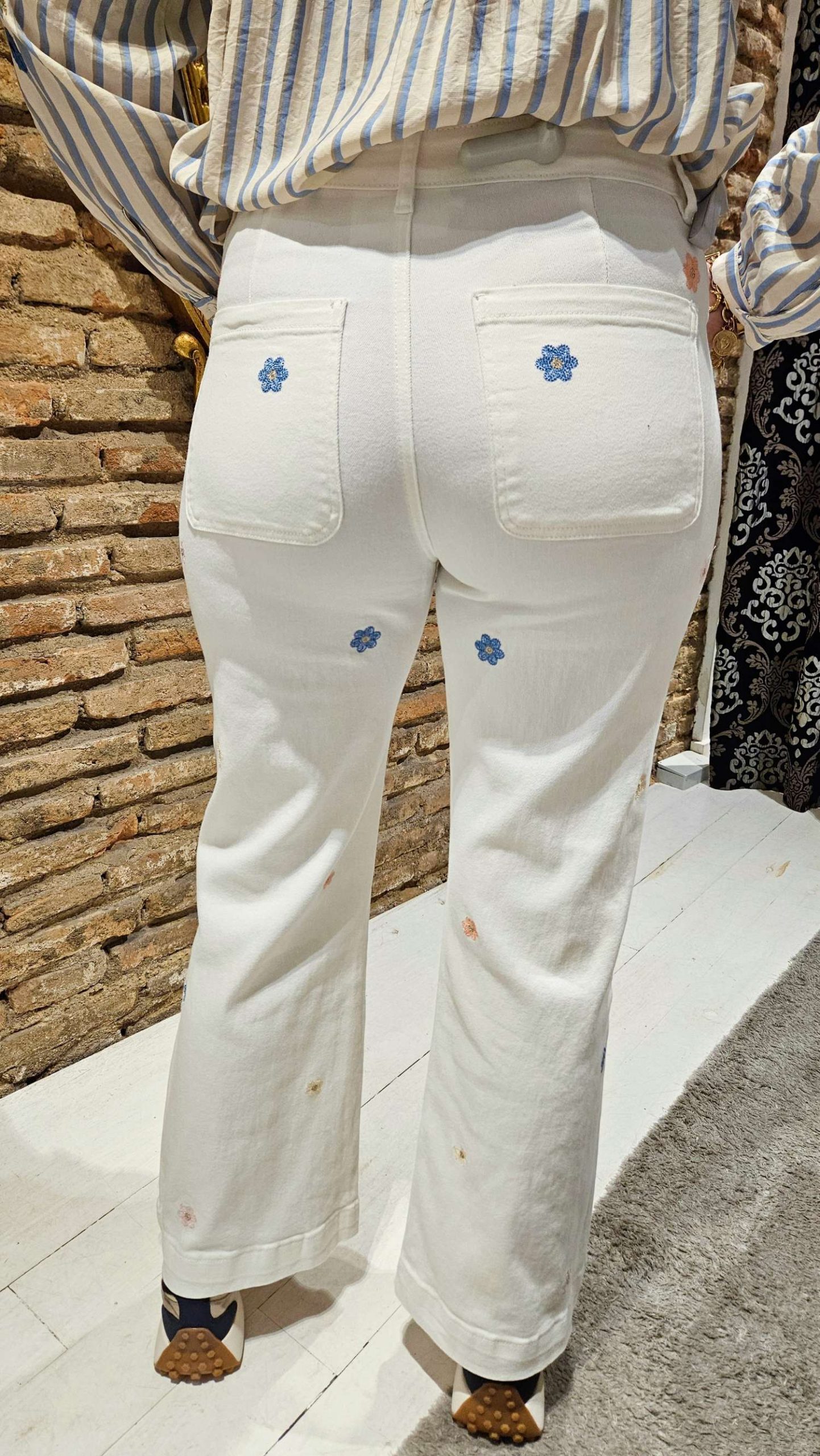 Pantalón vaquero de tiro alto, piernas rectas y anchas, bordado de flores multicolor que le aportan un toque delicado y encantador, detalle de la botonadura en la parte delantera que a la vez te alarga la silueta. Bolsillos plastón en la parte trasera.